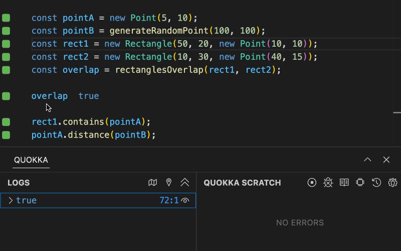 Quokka runs your JavaScript and TypeScript code and displays results inline in VS Code, WebStorm, and Sublime Text.
