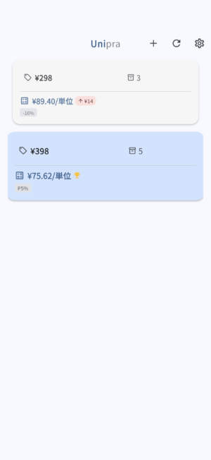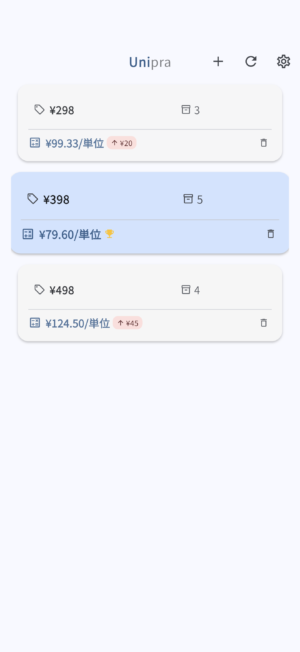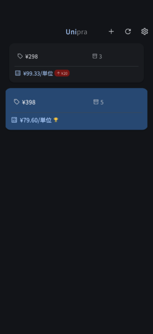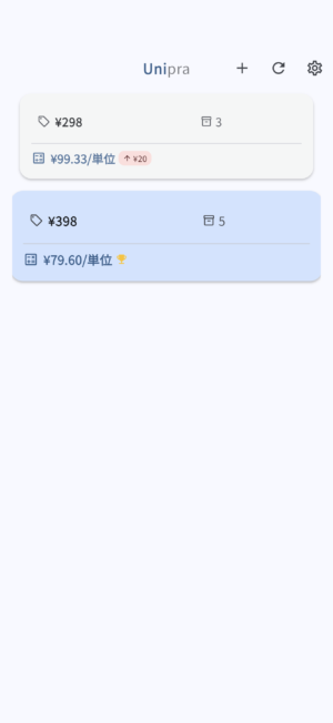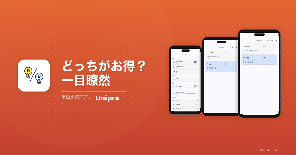 iOS/Android対応の単価比較アプリ「Unipra」をリリースしました。スーパーやドラッグストアで「3個入り298円と5個入り398円、どっちがお得?」と迷ったとき、価格と数量を入れるだけで最もお得な商品が一目でわかるアプリです。